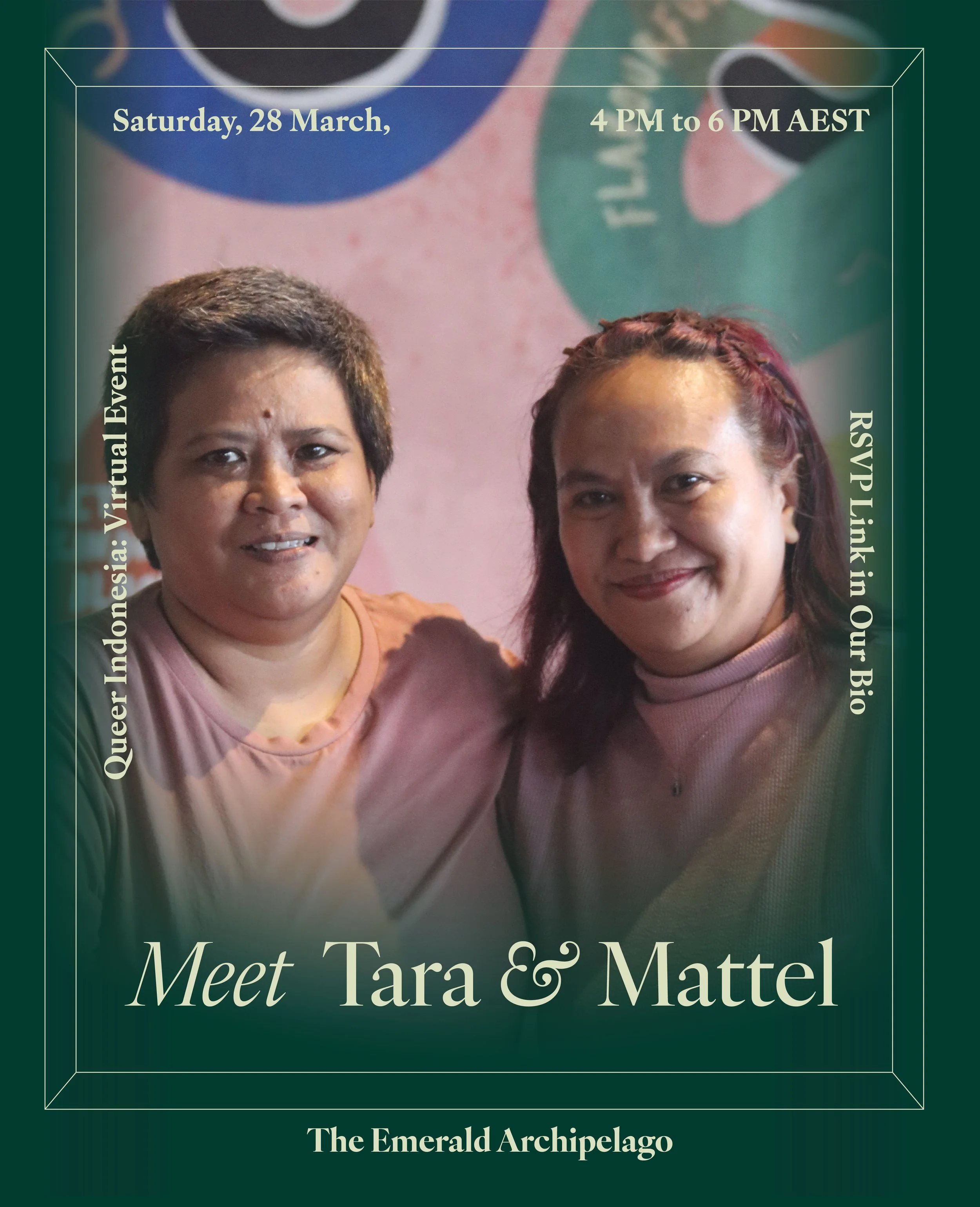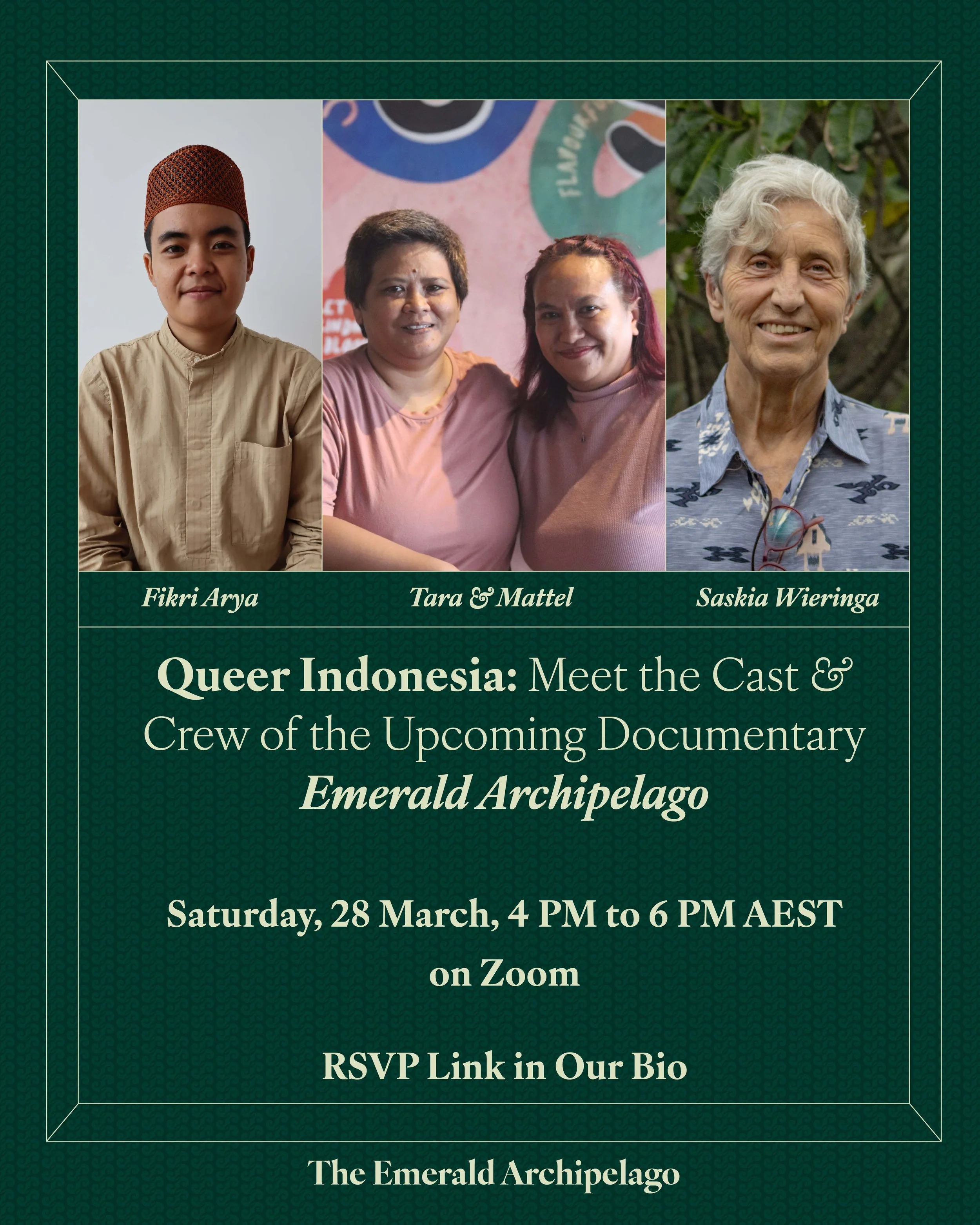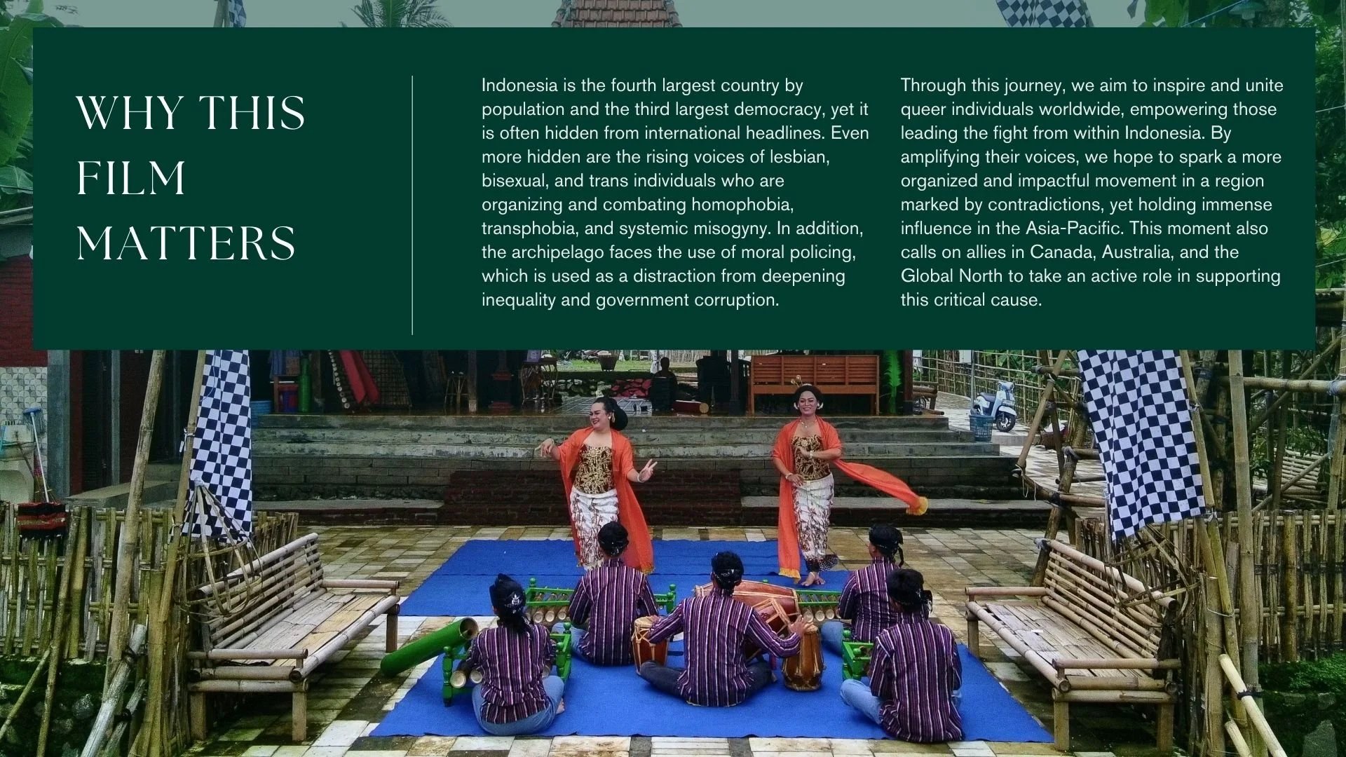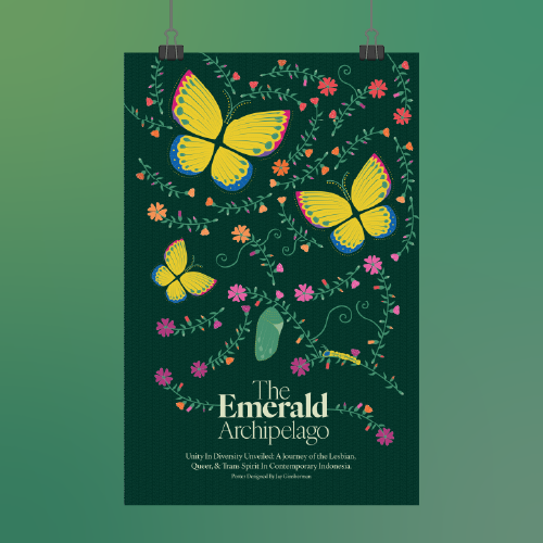 The colours of the flowers are inspired by the Lesbian flag. The butterfly, a Trans symbol, has the colours of the Bisexual flag. The poster shows the growing Lesbian, Bisexual, and Trans communities of Indonesia that are featured in the film.