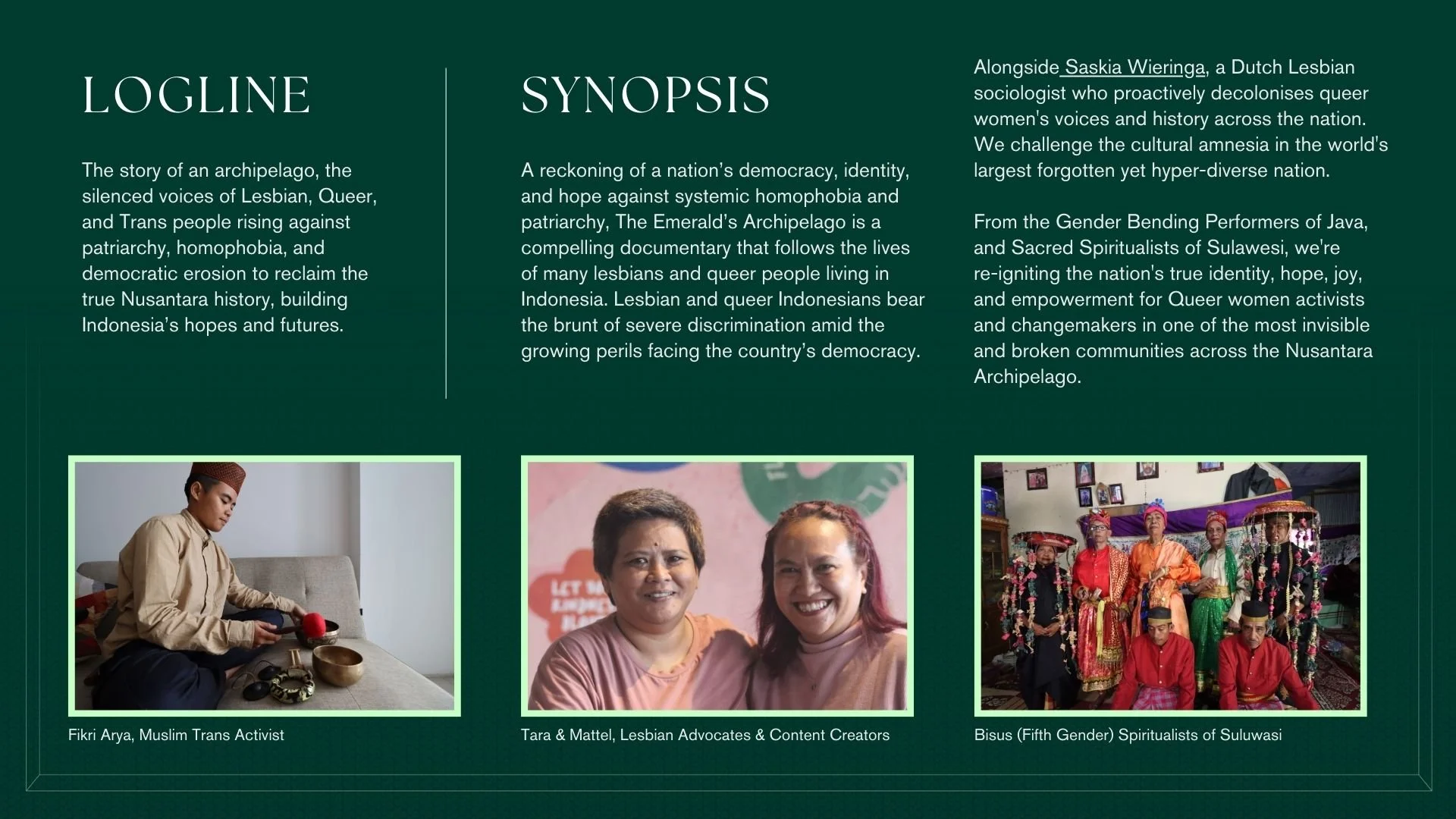 With Suling Bamboo Productions I developed a visual vernacular for their film Emerald Archipelago. A documentary on the voices of Lesbian, Queer and Trans people rising against patriarchy, homophobia, and democratic erosion in Indonesia. This project originally started as a collectible poster for a perk in their crowdfunding campaign. In the end, a total visual brand grew out of it.
